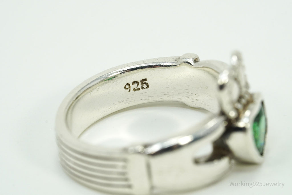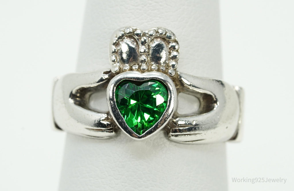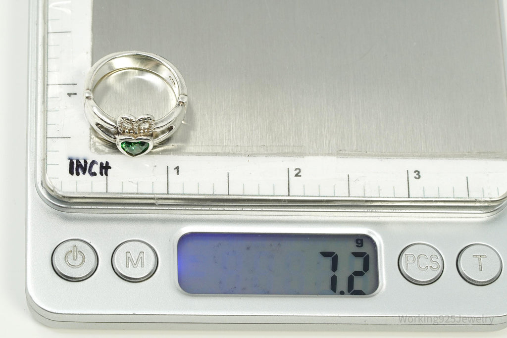 Vintage Green Tourmaline Heart Claddagh Sterling Silver Ring - Size 7.75