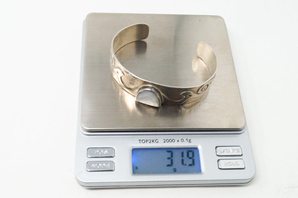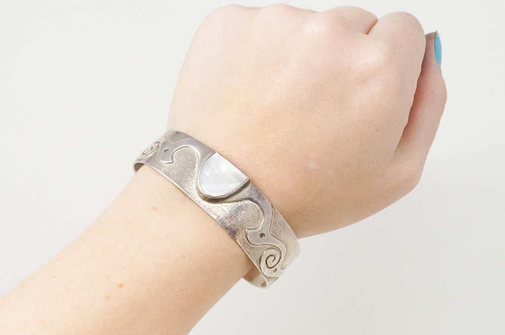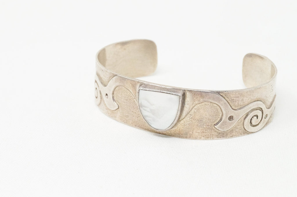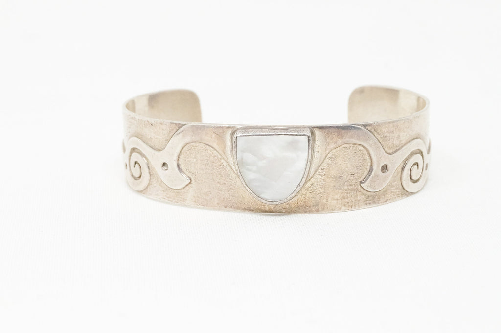 Vintage Handmade Native American Mother Of Pearl Swirl Sterling Cuff Bracelet