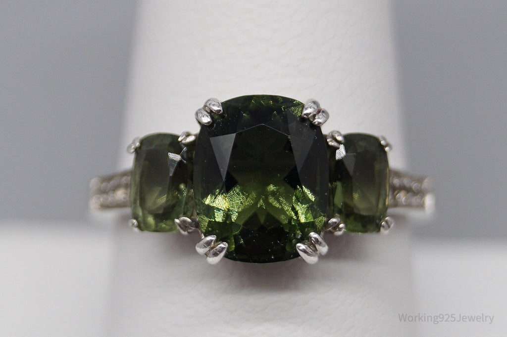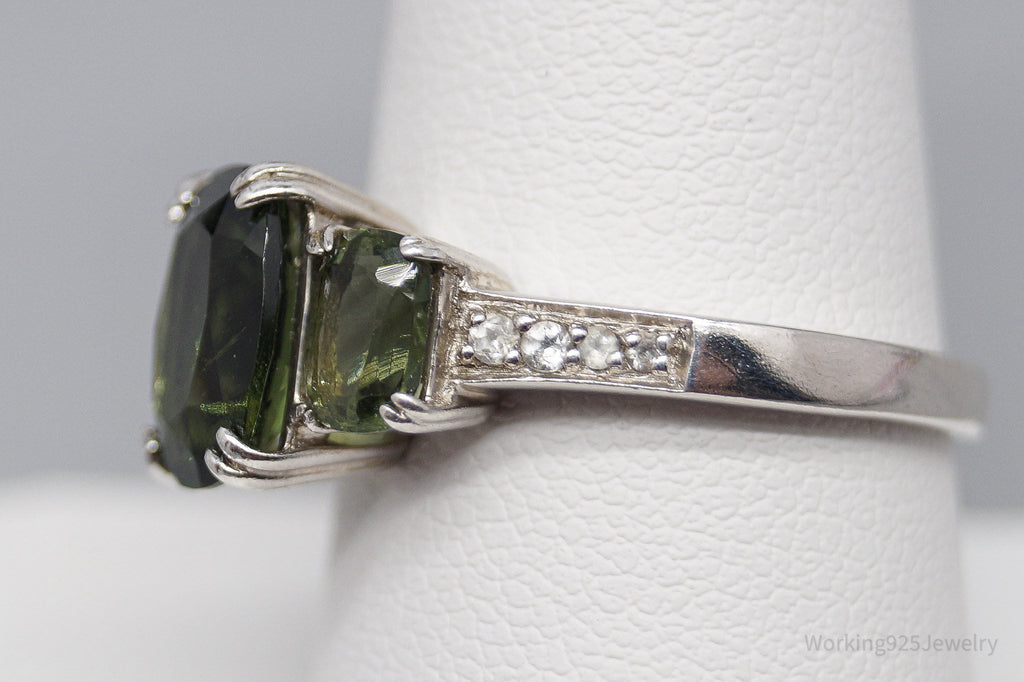 Vintage JTV's Green Moldavite & White Zircon Sterling Silver Ring - Size 9