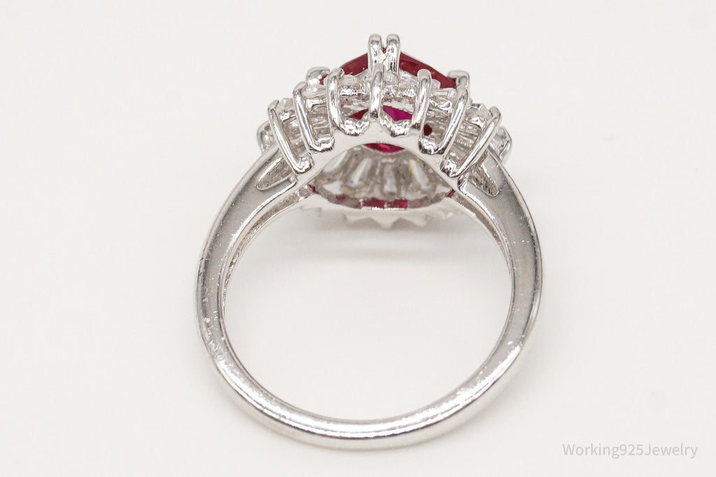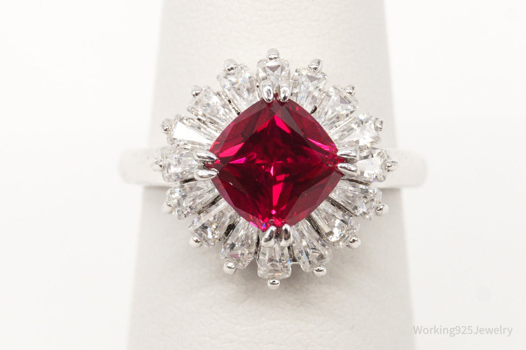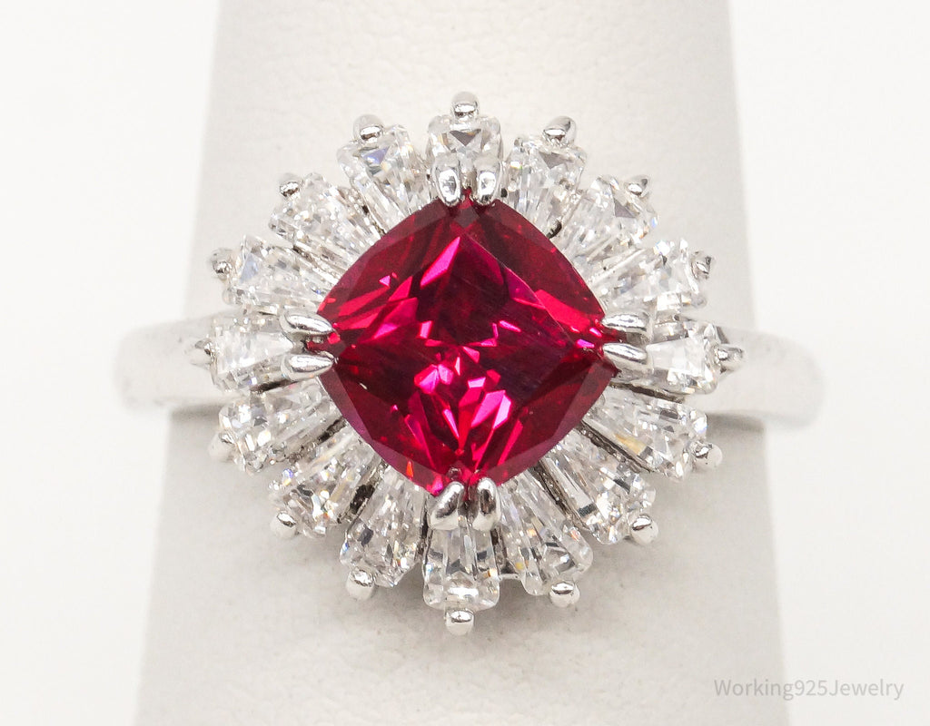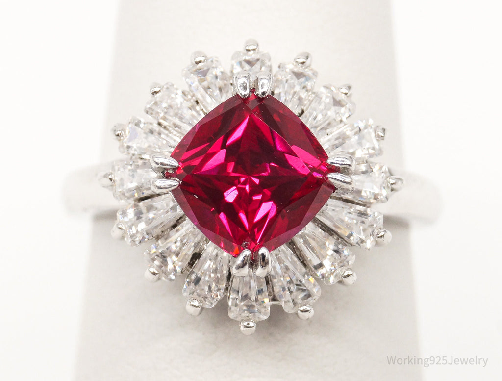 Vintage Lab Ruby Cubic Zirconia Platinum Clad Sterling Silver Ring - Size 5