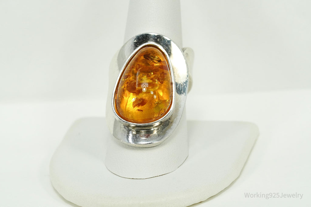 Vintage Large Amber Modernist Style Sterling Silver Ring - Size 9