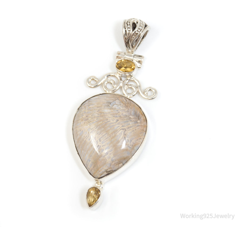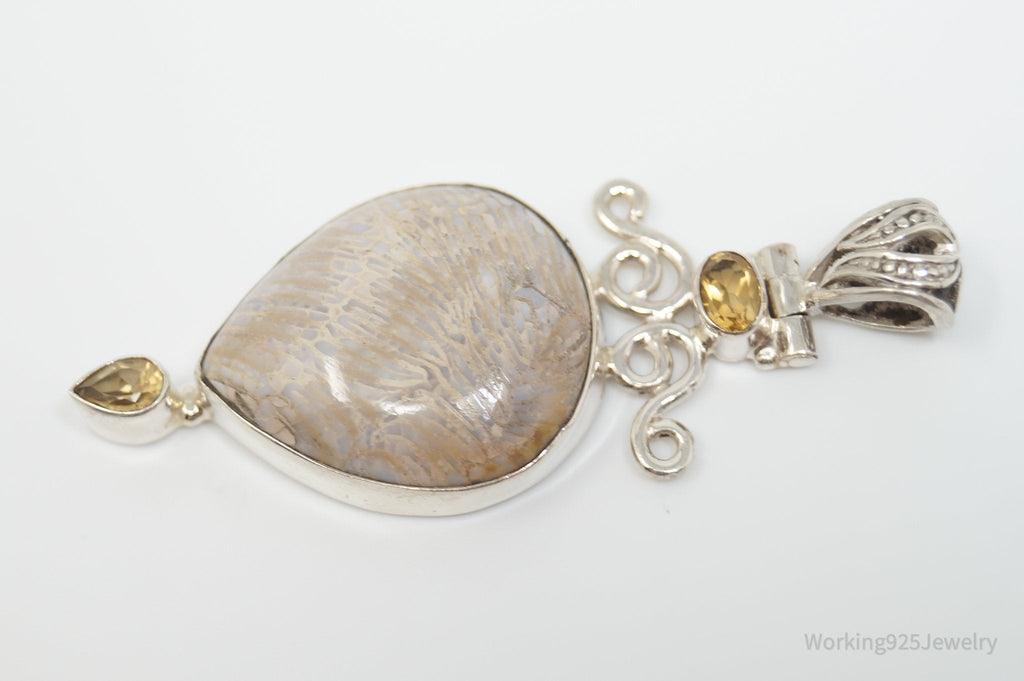 Vintage Large Cream Gemstone Citrine Scroll Sterling Silver Necklace Pendant