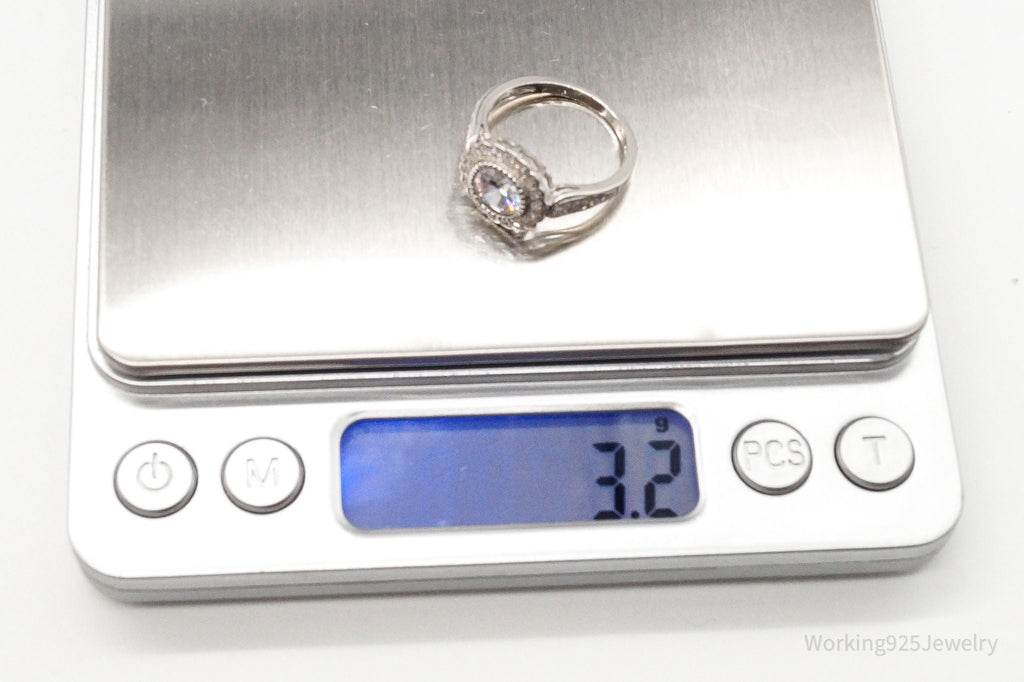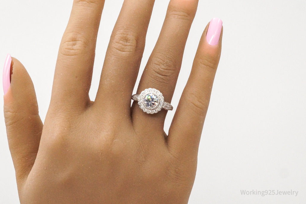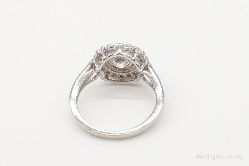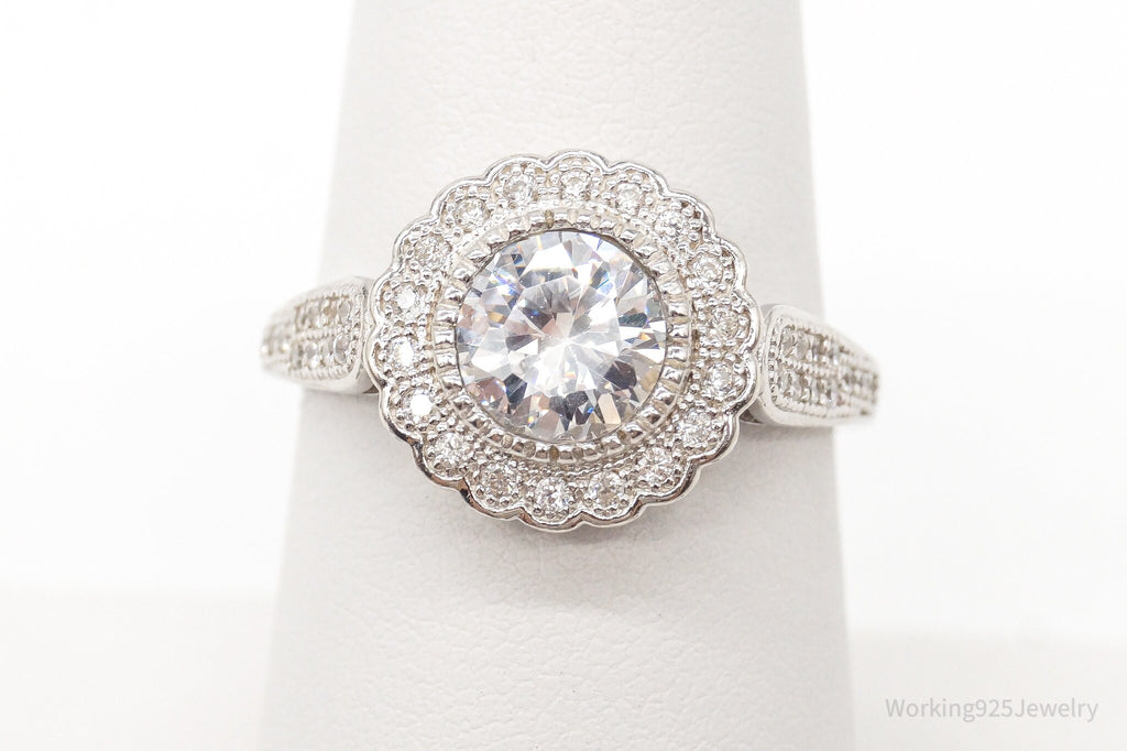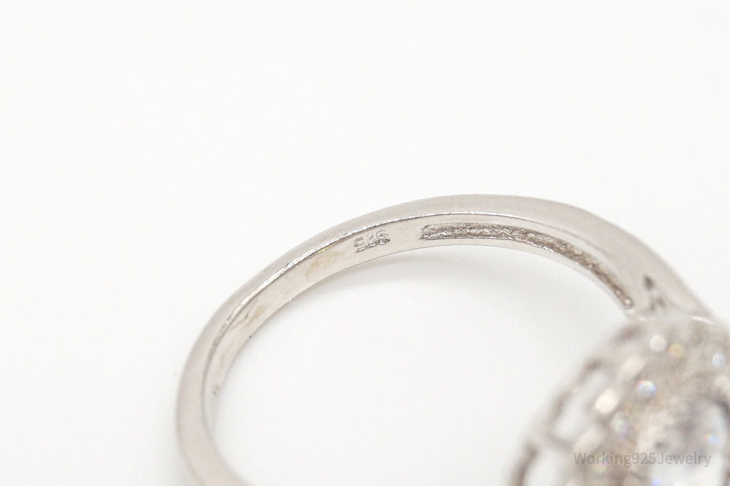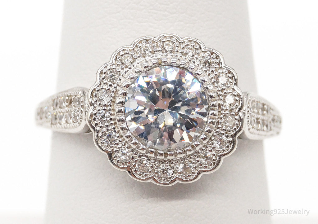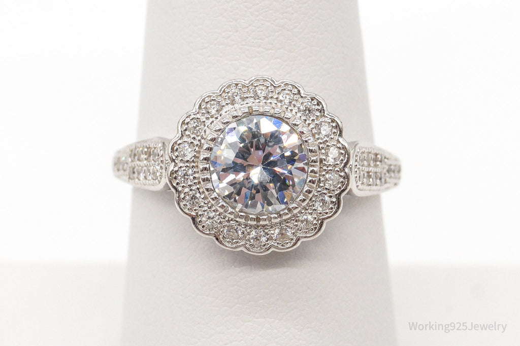 Vintage Large Cubic Zirconia Flower Sterling Silver Ring - Size 7