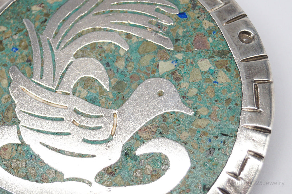 Vintage Large Mexico Gem Inlay Sterling Silver Brooch Pin Pendant 2"