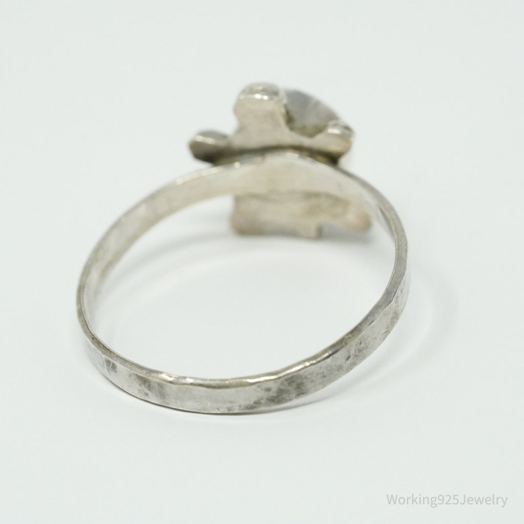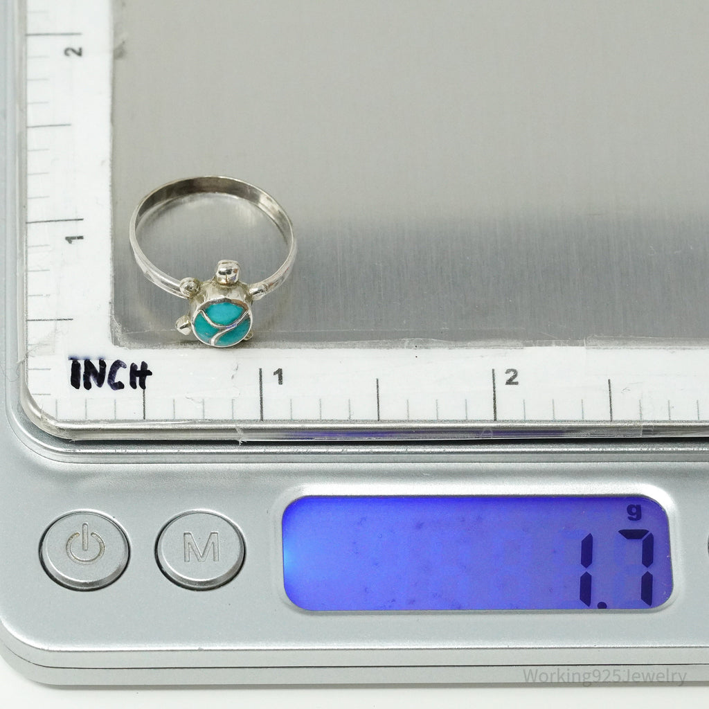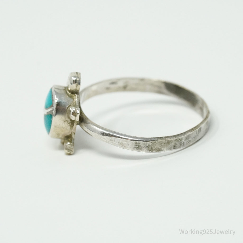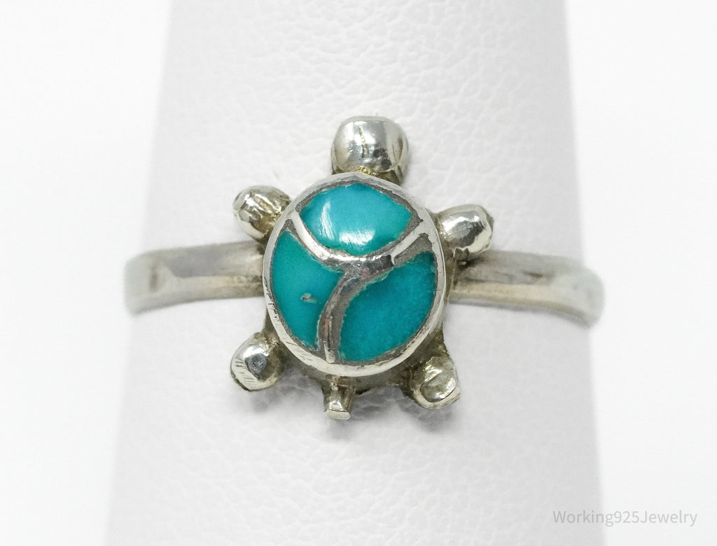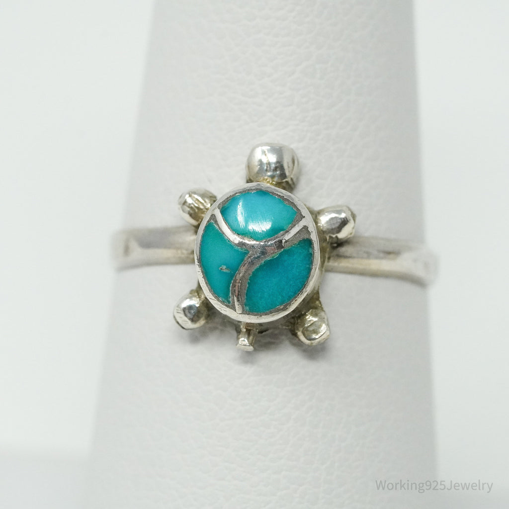 Vintage Native American Turquoise Inlay Turtle Handmade Silver Ring - Size 6.75
