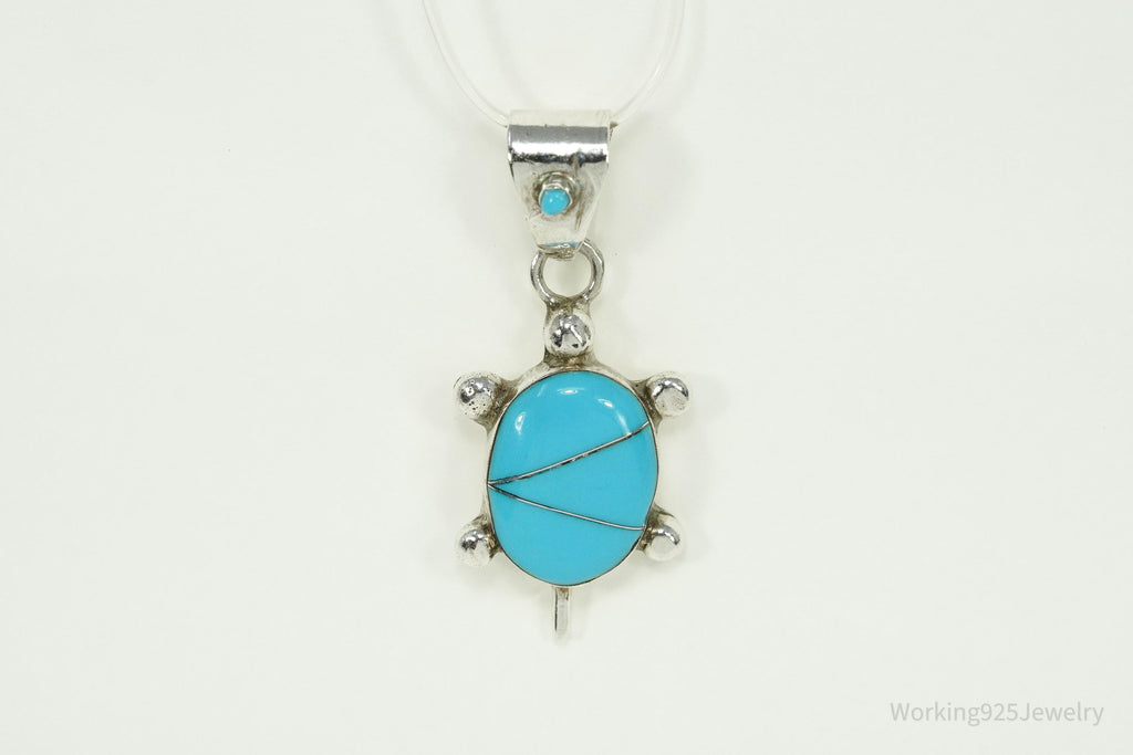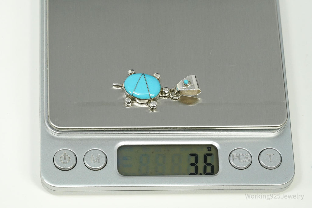 Vintage Native American Turquoise Inlay Turtle Sterling Silver Pendant 1.5"