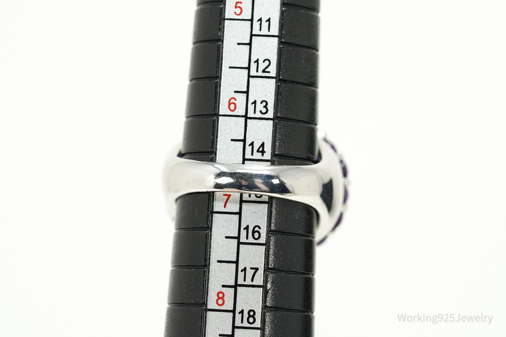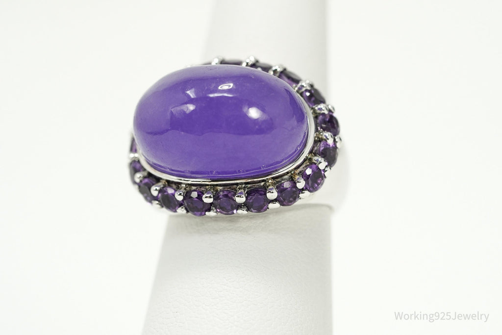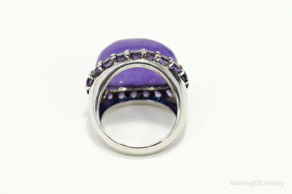This bold vintage sterling silver ring showcases a large oval cabochon commonly marketed as purple jade, but more accurately identified as dyed quartzite or chalcedony. The vibrant cabochon is surrounded by sparkling amethyst accents, creating a striking combination of textures and tones. Purple "jade" cabochons like this were especially popular in the 1980s-1990s, when jewelers embraced colorful, statement-making materials. Set in sterling silver, this piece captures that era's love of bold color and artistic design.