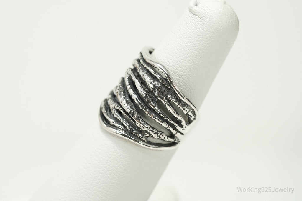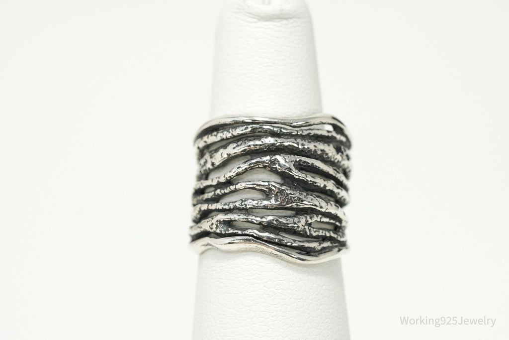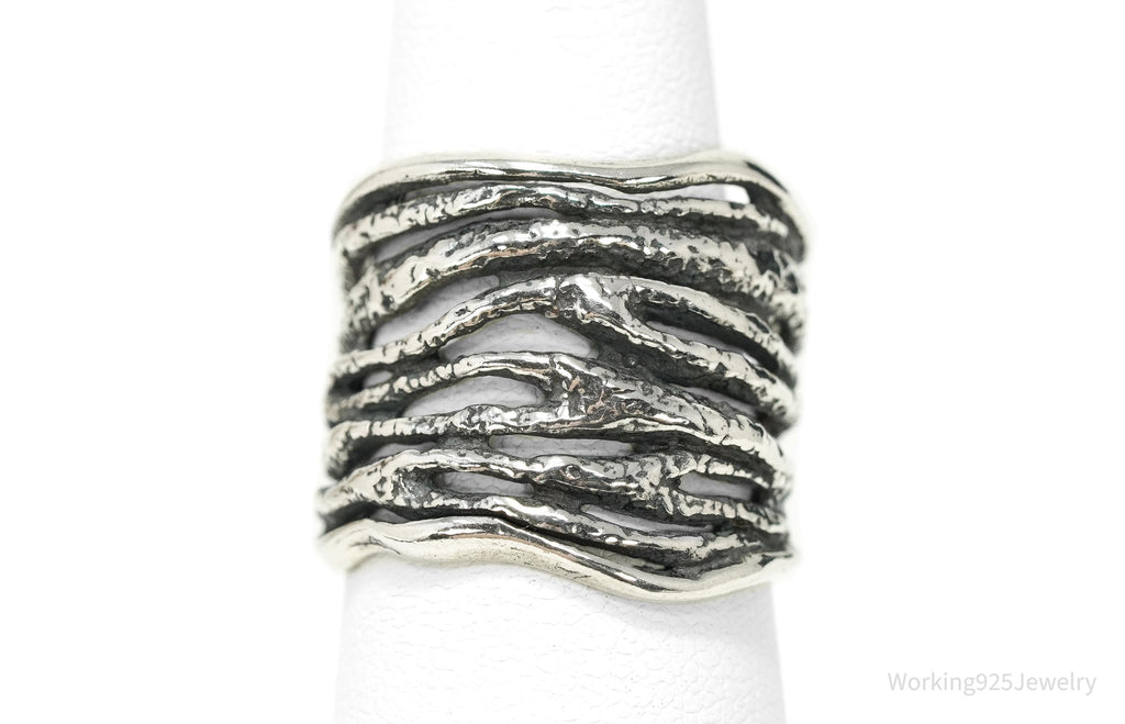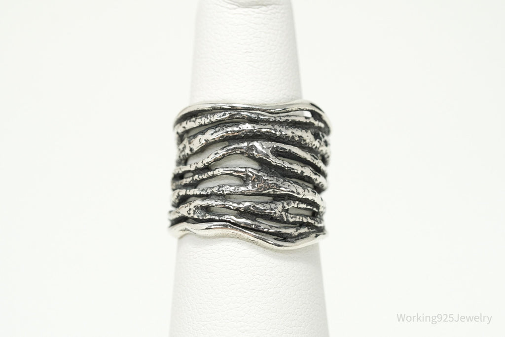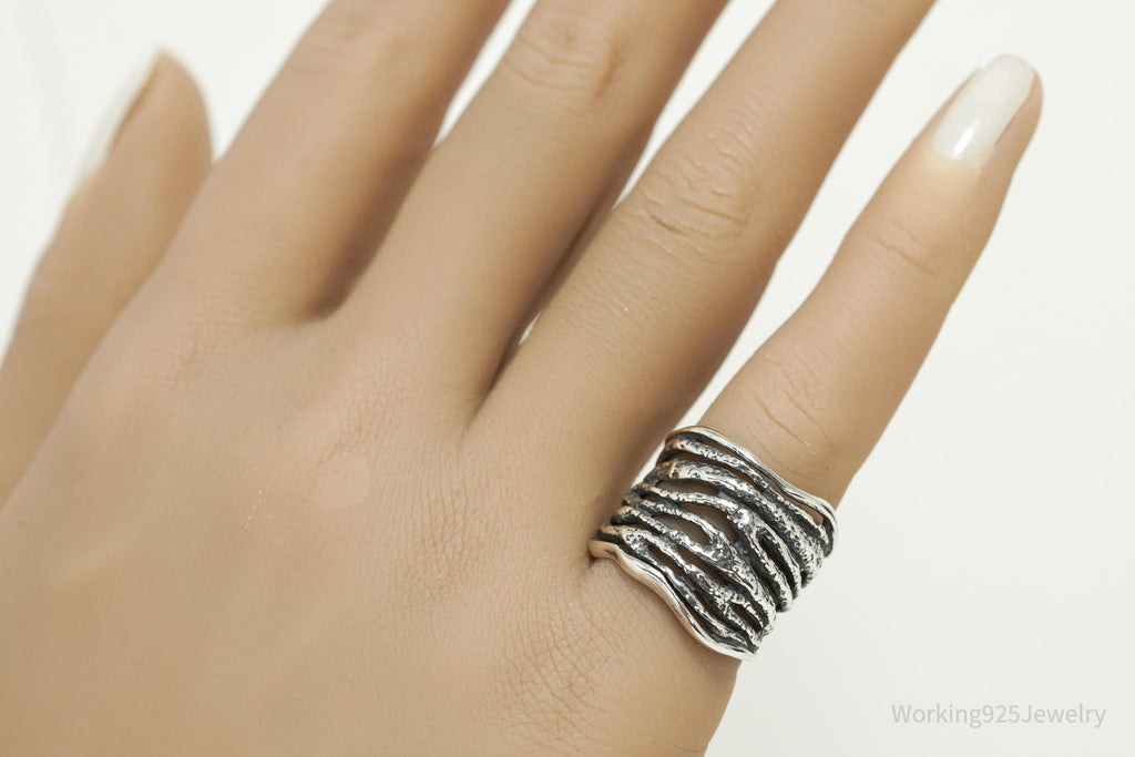 This striking Shablool Didae sterling silver band showcases the brand's signature textured design, with bold, flowing lines that mimic organic movement. Shablool, founded in Israel in the 1980s, has become internationally recognized for creating sculptural sterling silver jewelry that blends traditional craftsmanship with a modern, artistic edge. The wide band design makes a statement while still offering everyday wearability, perfect for collectors of Shablool or lovers of distinctive artisan silver jewelry.