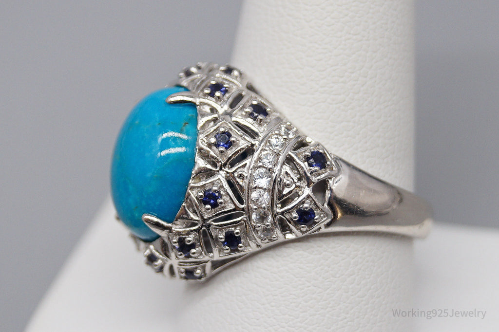 Vintage Turquoise Iolite Cubic Zirconia Sterling Silver Ring - Size 10