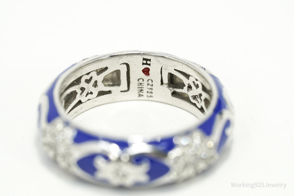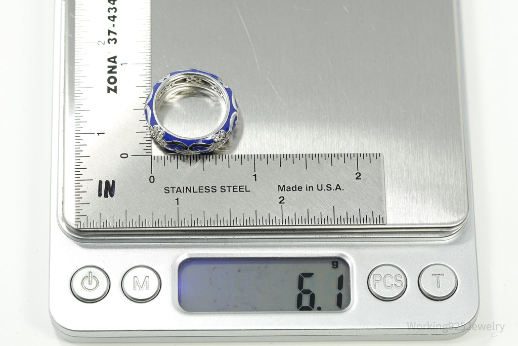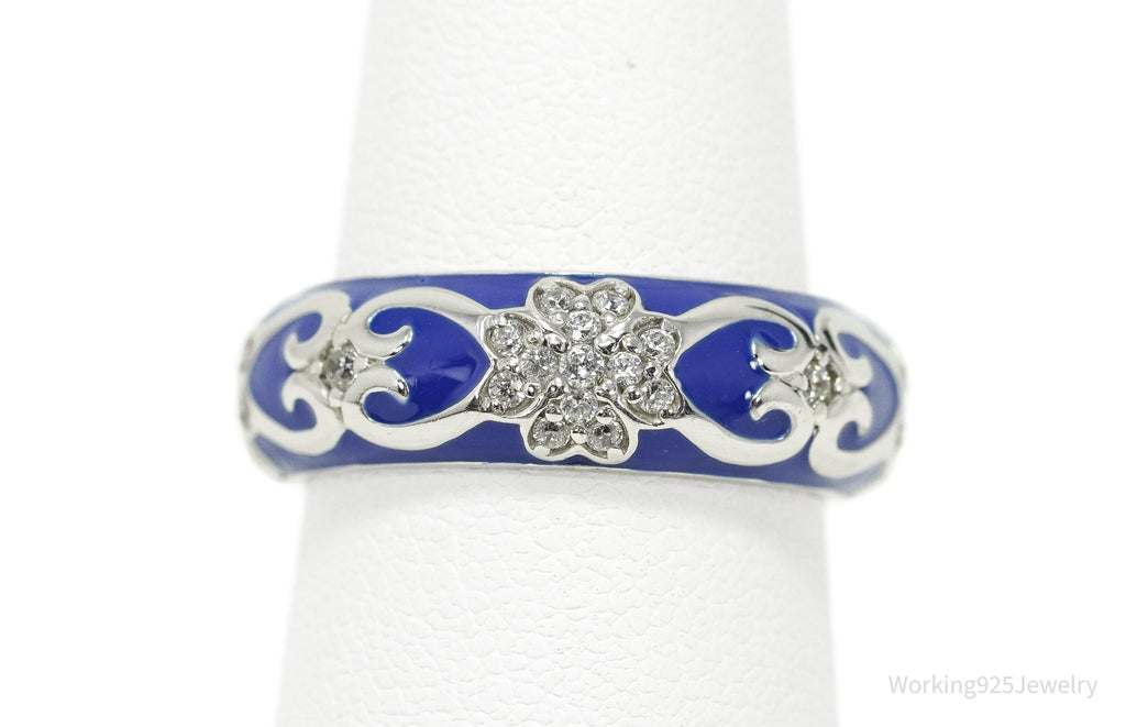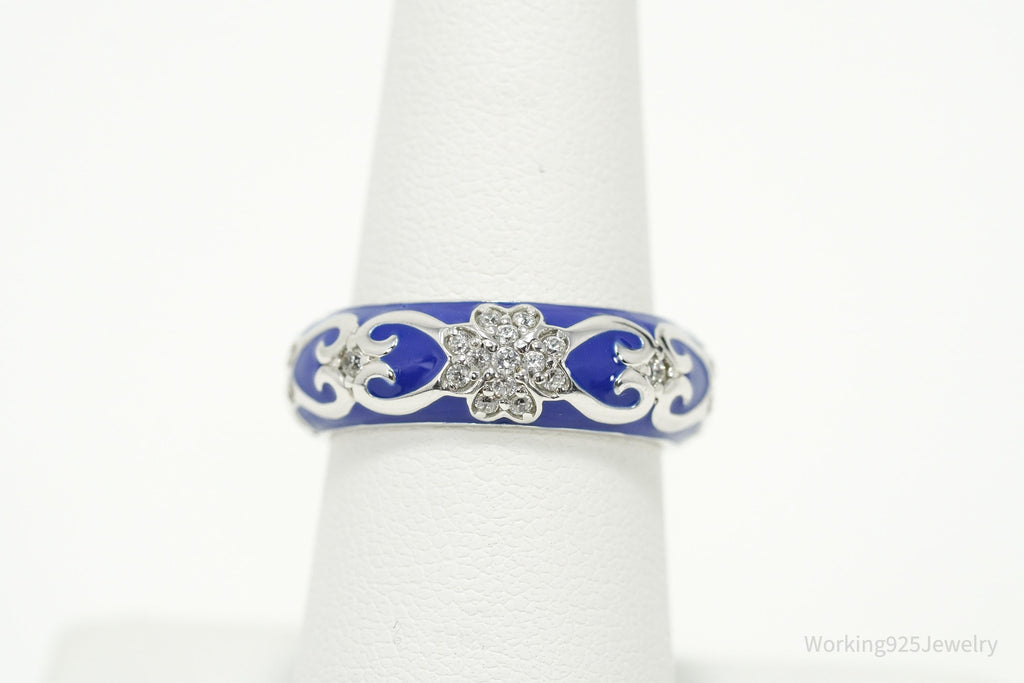 Vintage Cubic Zirconia & Blue Enamel Sterling Silver Ring - Size 7.25