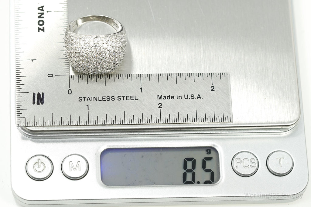 This vintage Italian Milor ring captures the glamorous Y2K aesthetic with its bold dome design, encrusted in a shimmering field of pave-set cubic zirconia. The look is unapologetically sparkly, reminiscent of the cocktail jewelry trends of the late 1990s and early 2000s when oversized, glittering statement rings were essential for night-out style. Crafted in sterling silver, the dome shape gives maximum surface for sparkle, catching the light with every movement. Milor is known for quality Italian craftsmanship, and this piece reflects that attention to detail with a smooth, comfortable fit despite its substantial presence. Size 7.25. A perfect ring for lovers of bold sparkle, Y2K fashion, or anyone wanting a standout piece that feels both vintage and right on trend today.